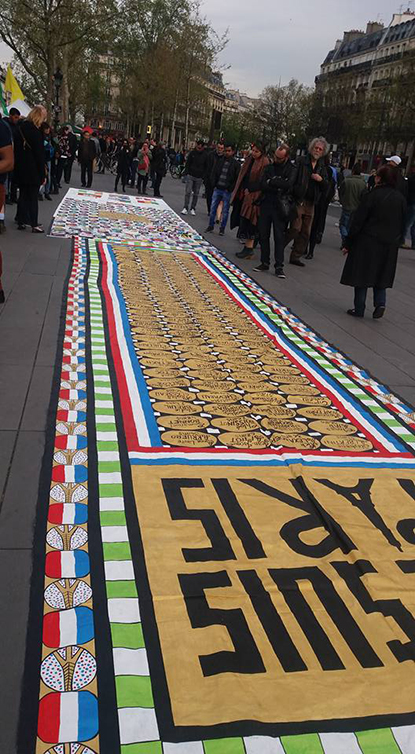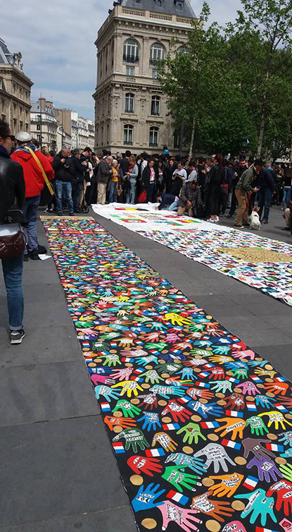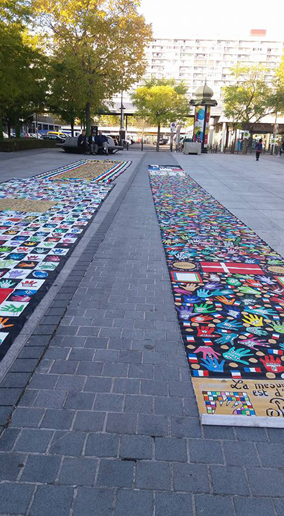 Realization of large participatory frescoes to pay tribute to the victims of attacks and for peace, tolerance and living together. Collecting handprints carrying messages from people in different places in order to make a tour of France, of Europe and a world tour. I use cotton fabric, gesso, acrylic paint, brushes and markers.