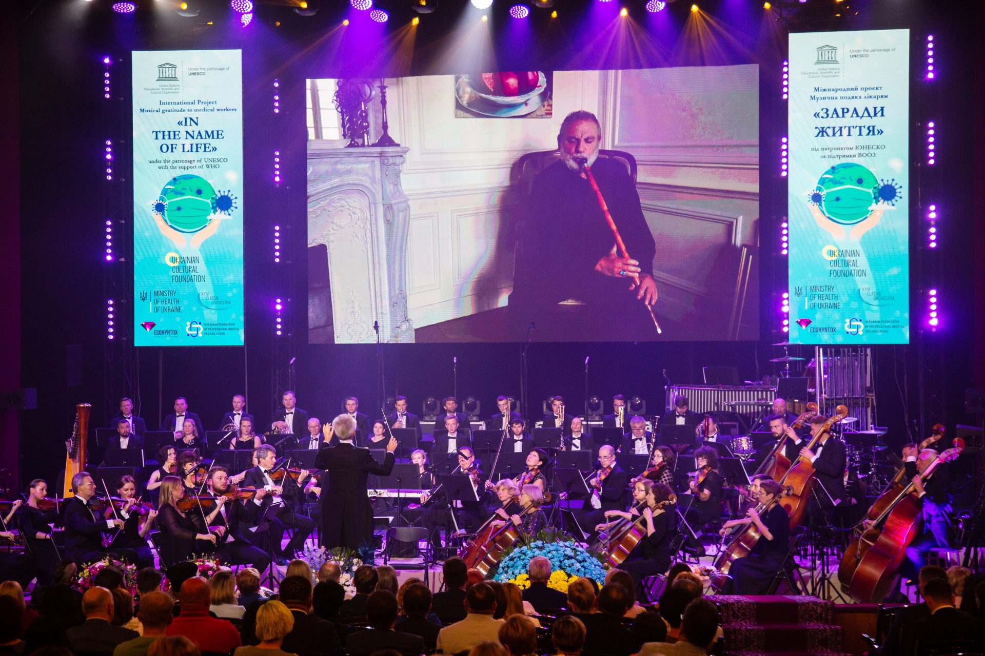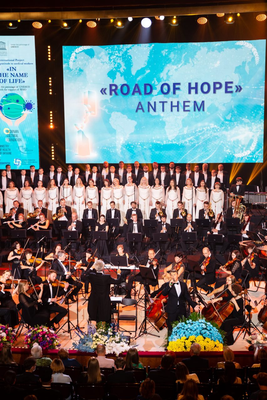 The program featured several pieces from each continent. The world premiere of the “Road of Hope” hymn by the French composer Pierre Sebaoun, created as a tribute to the sculpture of the UNESCO Goodwill Ambassador French sculptor Hedva Ser, was performed. The project also presented a fundamentally new format – online and offline collaborations which responded to the challenges posed by the COVID-19 pandemic. The Turkish composer, UNESCO Artist for Peace, Kudsi Ergüner perfomed in real-time the instrumental part, which was shown online on a screen in the concert hall, being accompanied simultaneously by the Kyiv Classic Orchestra. It was significant that the musicians were performing simultaneously this composition, being in different countries.