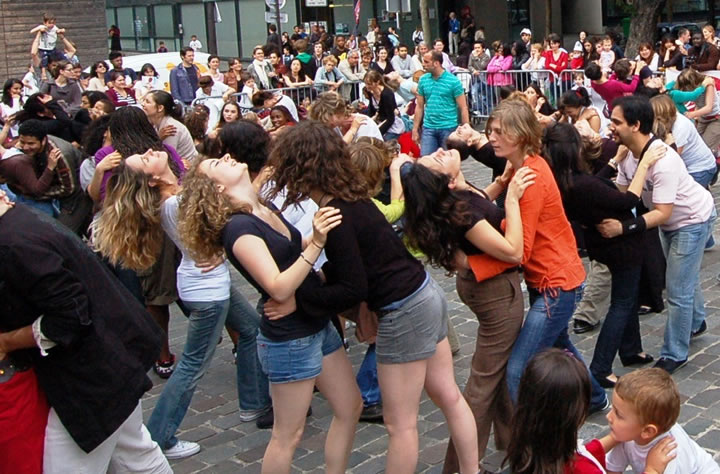 They questions pleasure, gender, notions of freedom and constraint, using as a tool the act of federation found in a collective dance, while able to also valorise each individuals and their singularities, reflecting on personal development and on social cohesion.