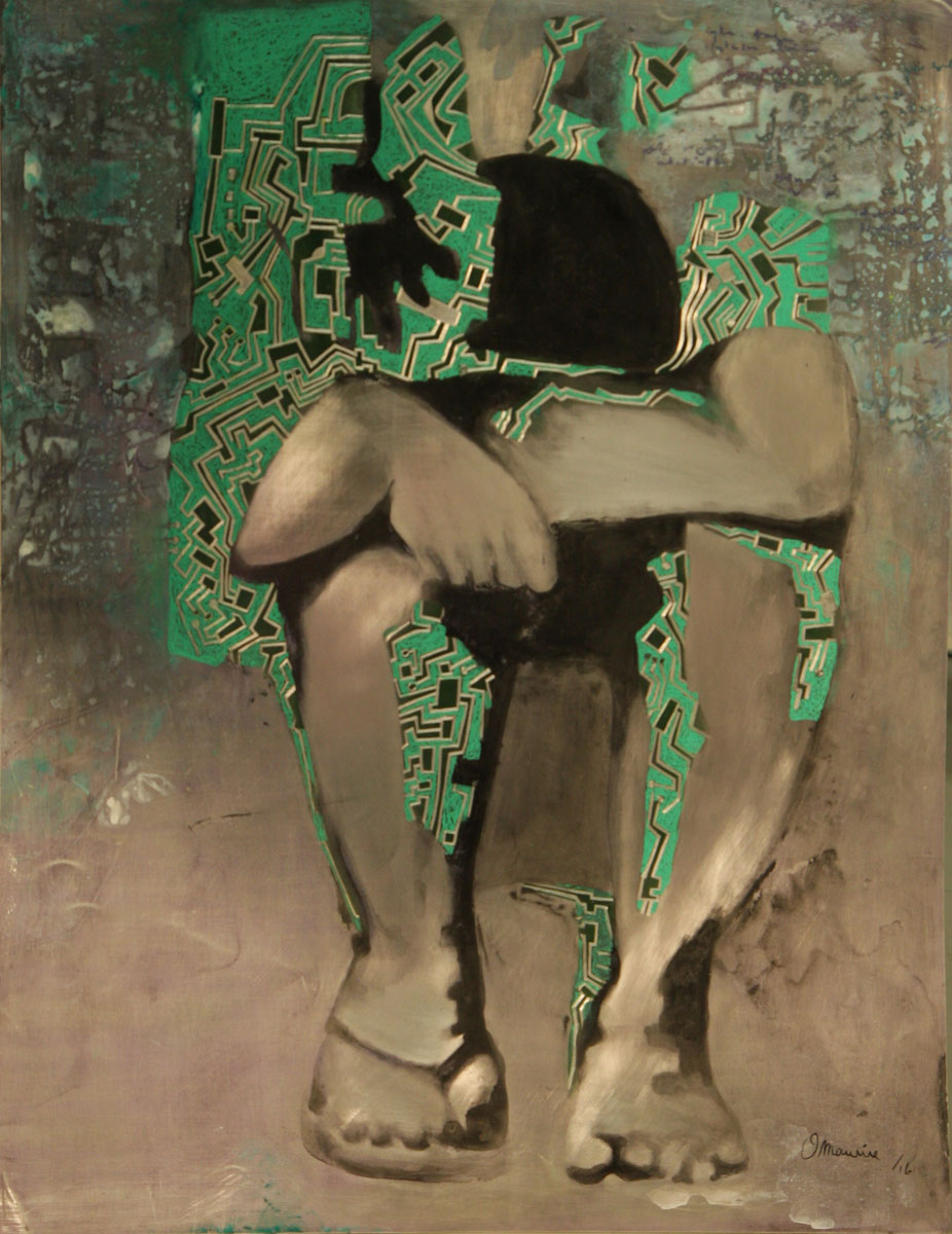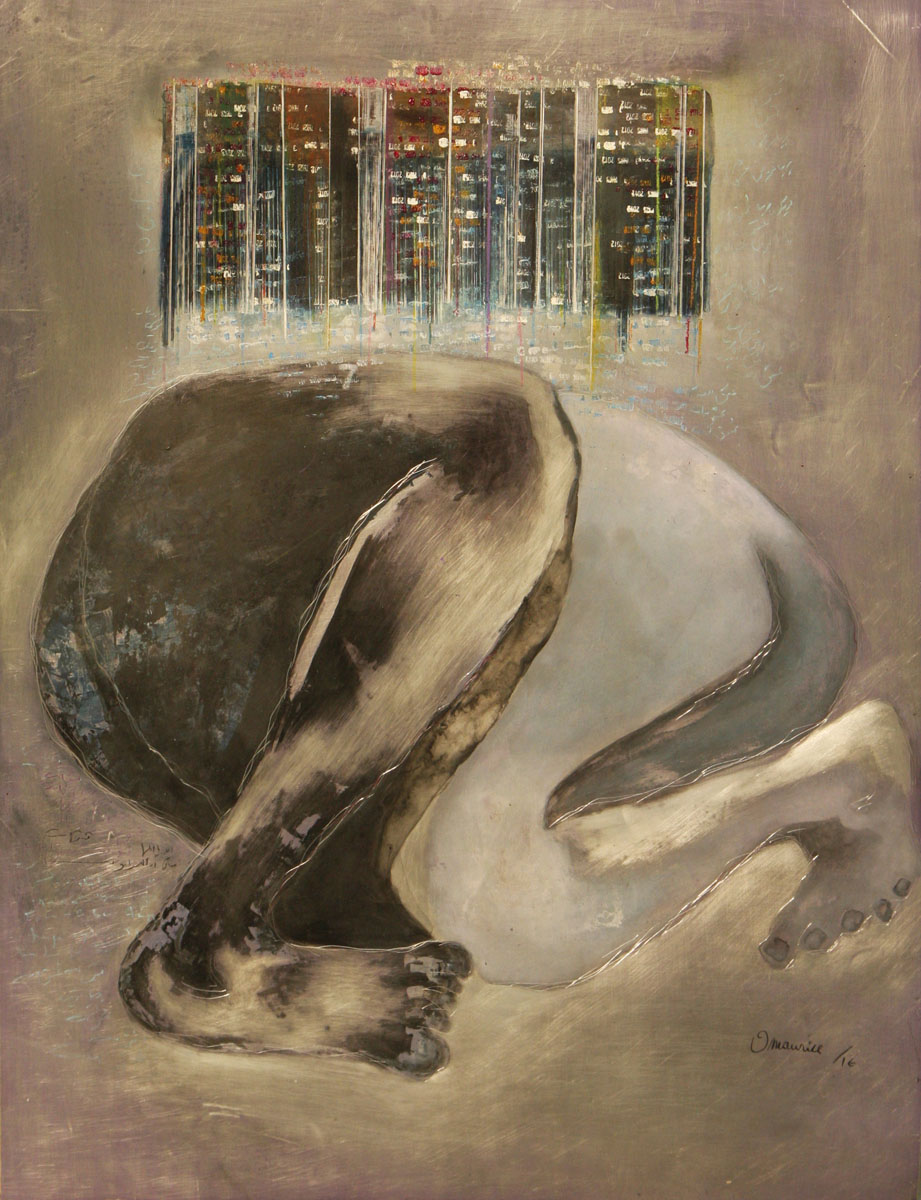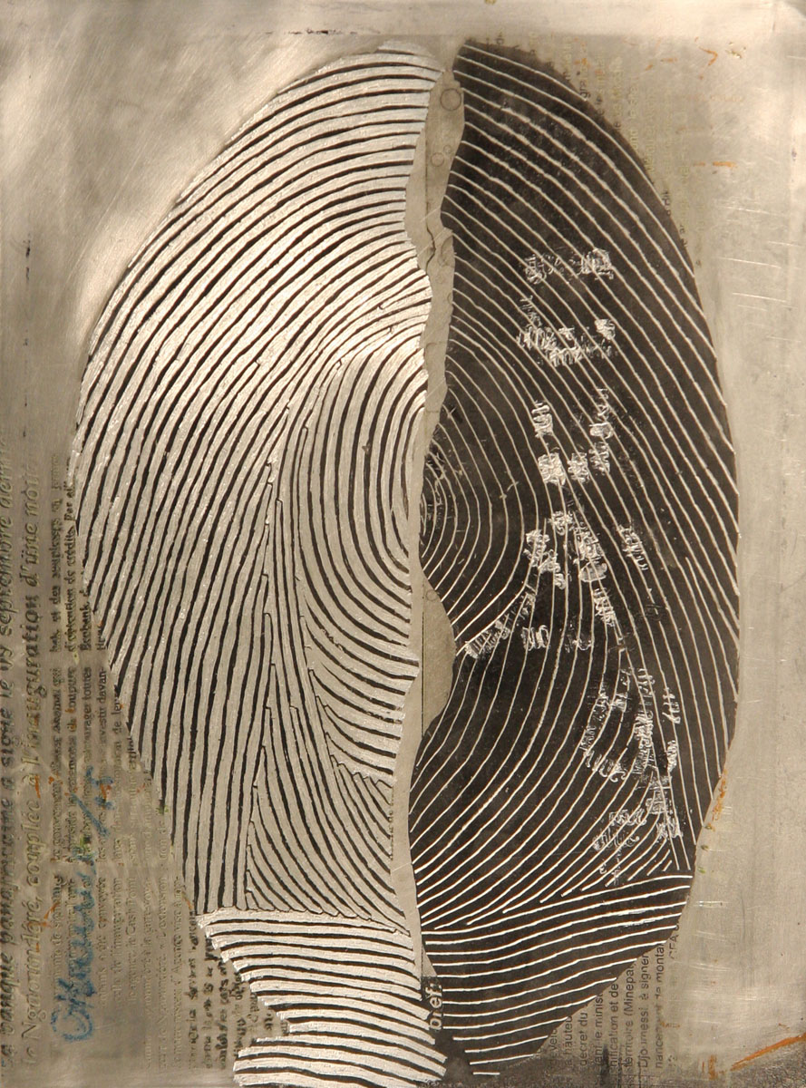 O’Maurice Mboa works on plates using an engraving technique he has been developing for years. He distinguished himself by a transversal research linked to his traditions and his land, oriented towards the inevitability of decentralization and globalization – terms often used nowadays with a scope that is very difficult to grasp. In this respect he might be called a “glo-cal” artist because his work associates a global and a local vision.
