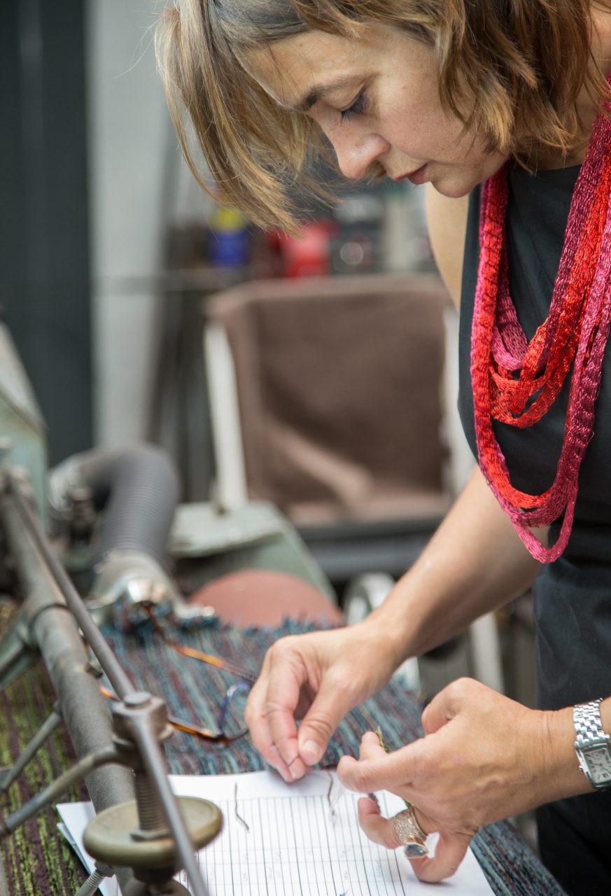 In 2010, she took over an old weaving studio south of Lyon that was about to close and surrounded herself with a team of skilled weavers. She now creates high-quality fabrics in linen, silk, wool, mohair and leather.