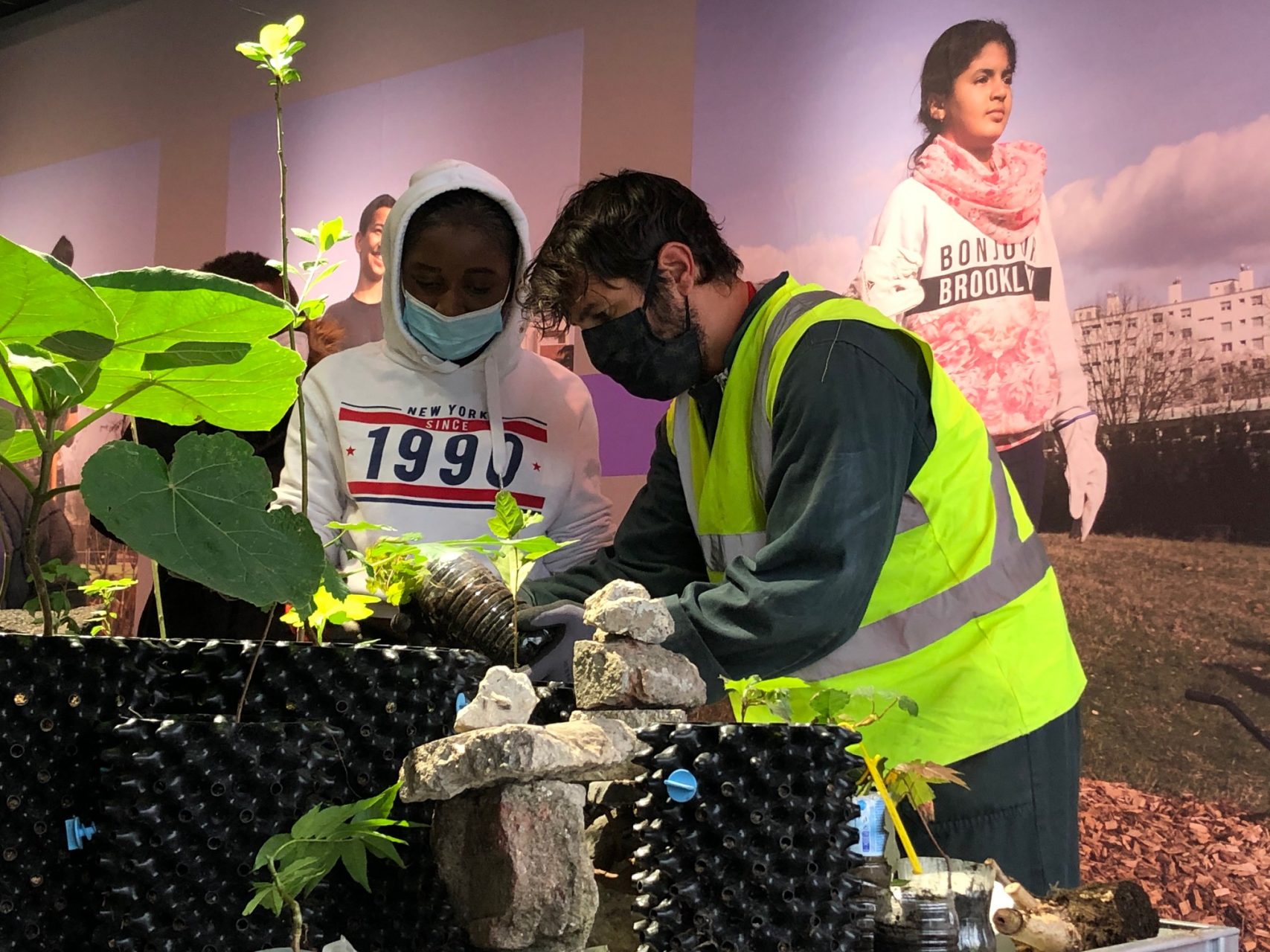 The exhibition Courant Verts at the Espace EDF presented works by artists who explore the relationships between people and nature, and especially about the current geological age—the Anthropocene—the period during which humanity has had a dominant effect oin the environment. The goal of the dialogue was to enable the creation of new narratives, in particular by taking concrete action. This is the case for Thierry Boutonnier, an artist and former agricultural worker, whom we were lucky enough to meet that day, and who invited the young visitors to collaborate in his work, Recherche forêt, composed of young plant shoots taken from disused urban areas and that will later be transplanted back into the urban forests of Paris. The project shows how art and artists can participate in, and accompany the important mutations of our time.