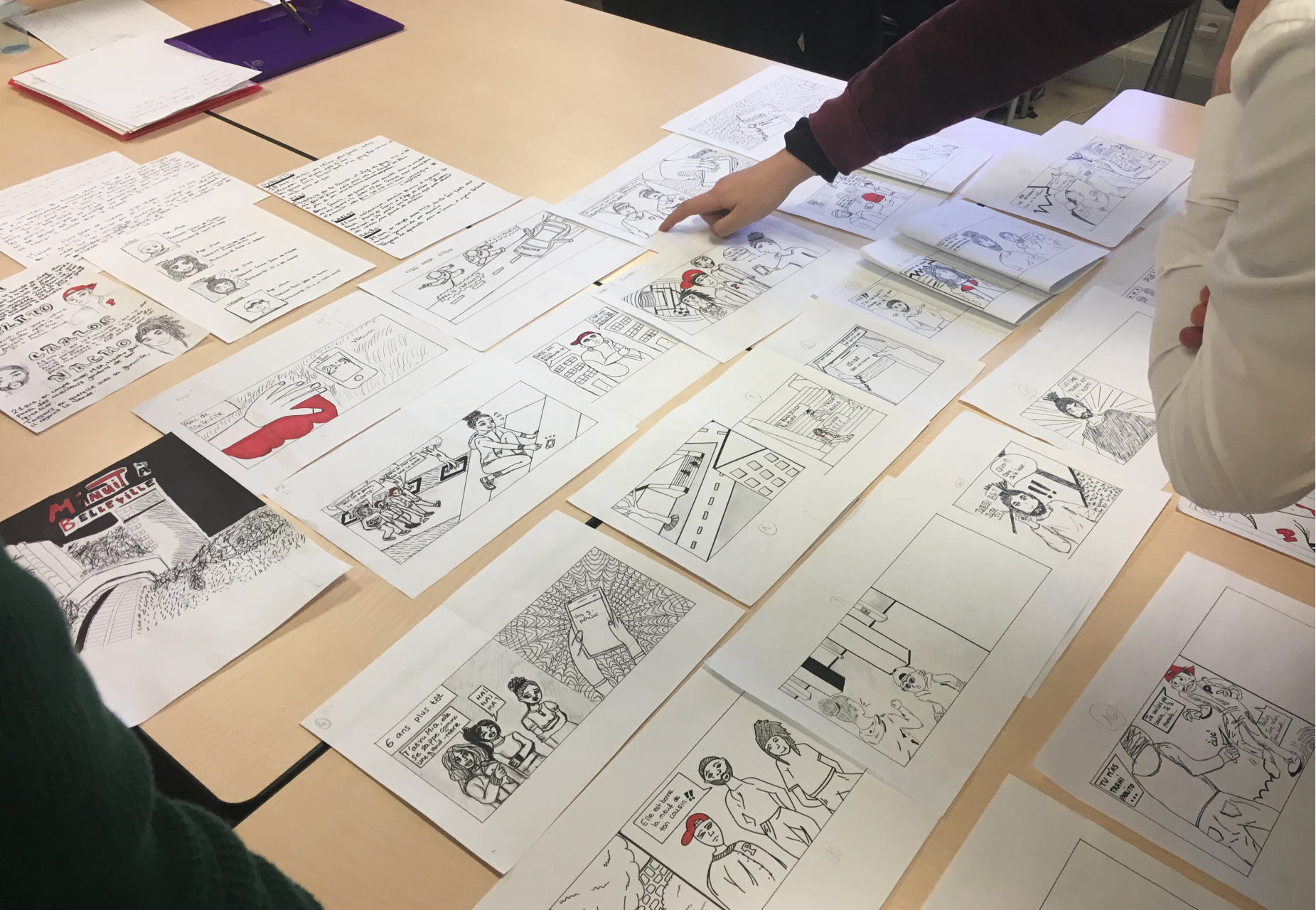 The workshop Comics in Class was held at the jail of Villepinte with two groups. There were large disparities in French language skills; several particpiants were multi-lingual and others spoke a language other than French. In this context, artists Isabelle Gozard and Nicolai Pinheiro used several language exercises to encourage dialogue. During the last session, the participants began to construct a script and the first narrative sequences of their comic book.