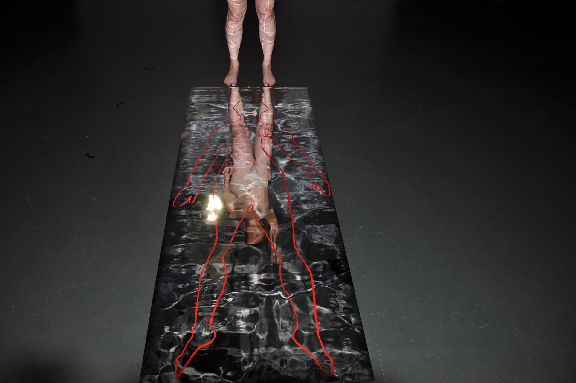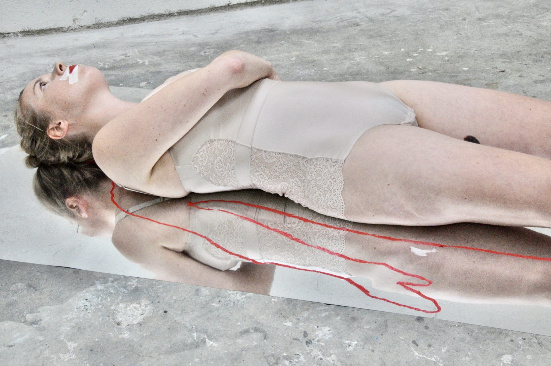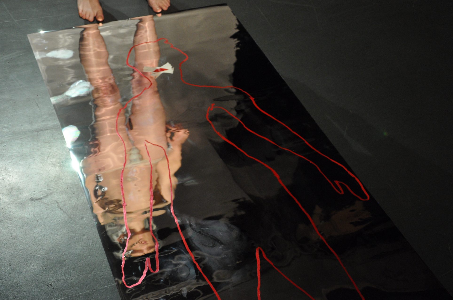 Beyond the act of denunciating these constraints, the artist delivers a message of freedom and individual expression. She gives a performance during which she traces the outline of her body on a mirror with lipstick, revealing an imprint reminiscent of crime scene photographs.