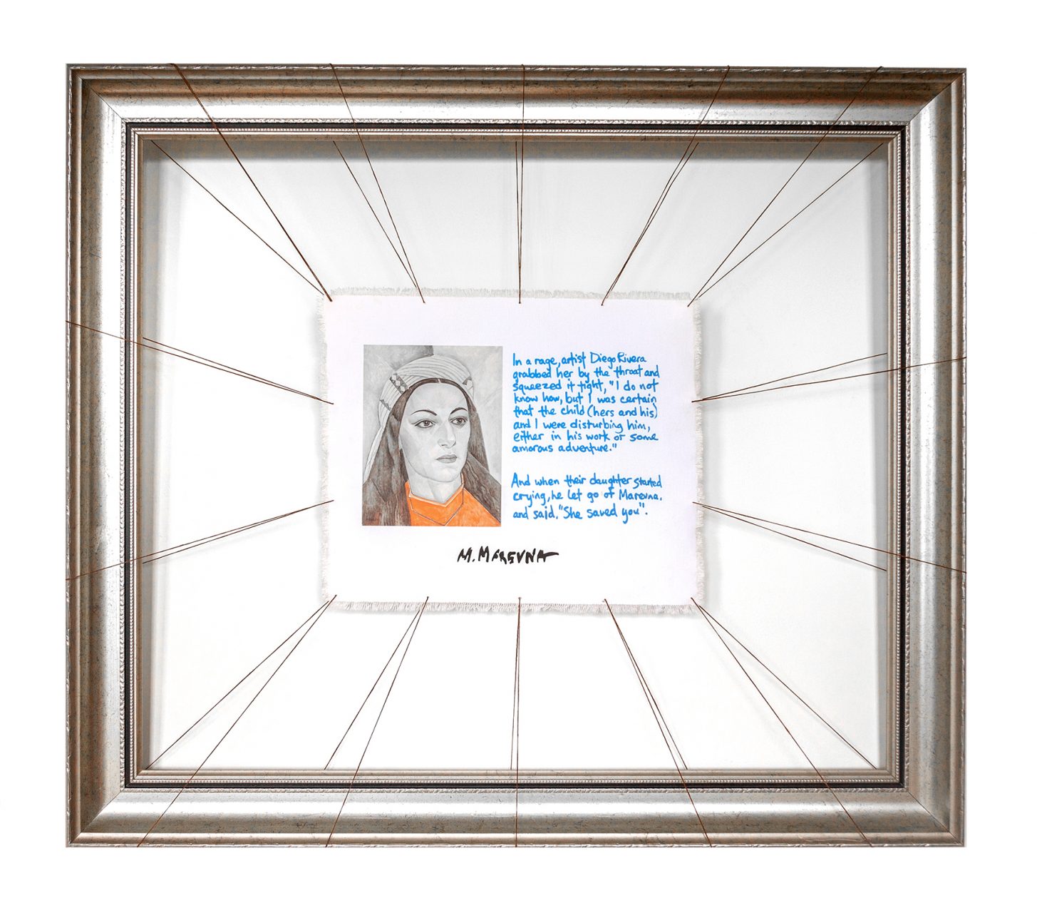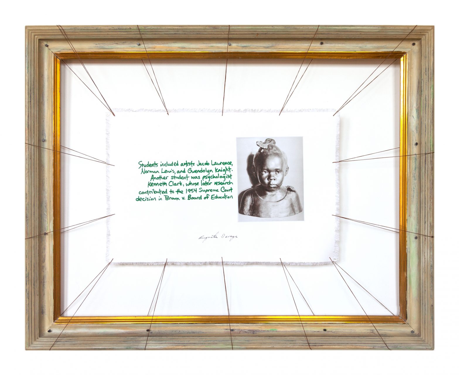Using waxed bookbinding string and hand-me-down frames, I have attempted to highlight how close these artists have gotten to become well-known artists. The bookbinding string is the same as the string used to assemble the textbooks that teach people who the “great” artists were. The hand-me-down frames symbolize the ways these artists end up being ignored to pay attention to artists who fit the White European Male archetype.