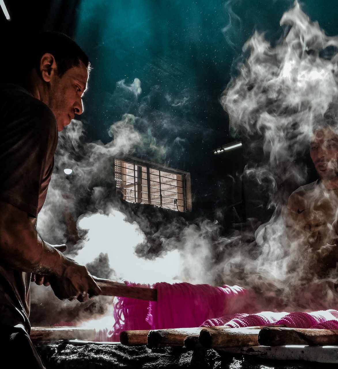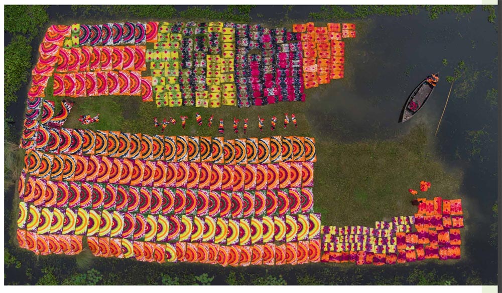 Villagers of Bunty Village, Narayanganj, Bangladesh dry Batik print textiles on the riverbank. This region, and its people, sit at a junction of the Silk Roads, a connection between the East and the West. The people pictured here keep this chain of textile exchange running through their skill, effort, and love.
