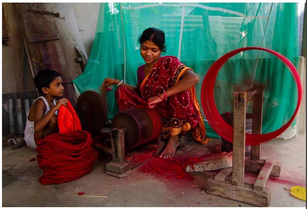 In a remote village in Shantipur, West Bengal, India, a woman makes thread for sarees on a handloom. Her young son watches, observing this important traditional craft skill.