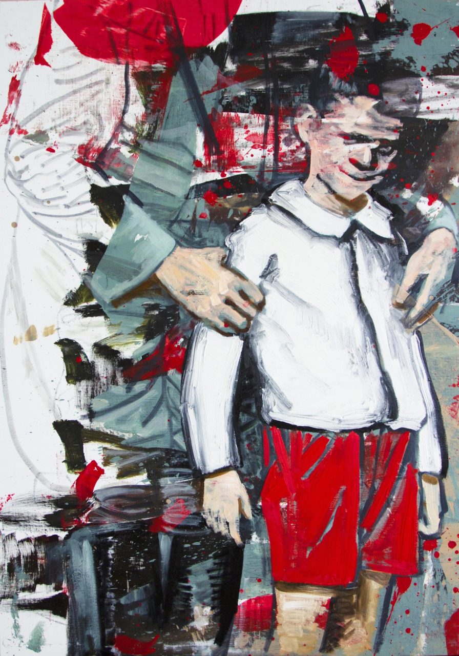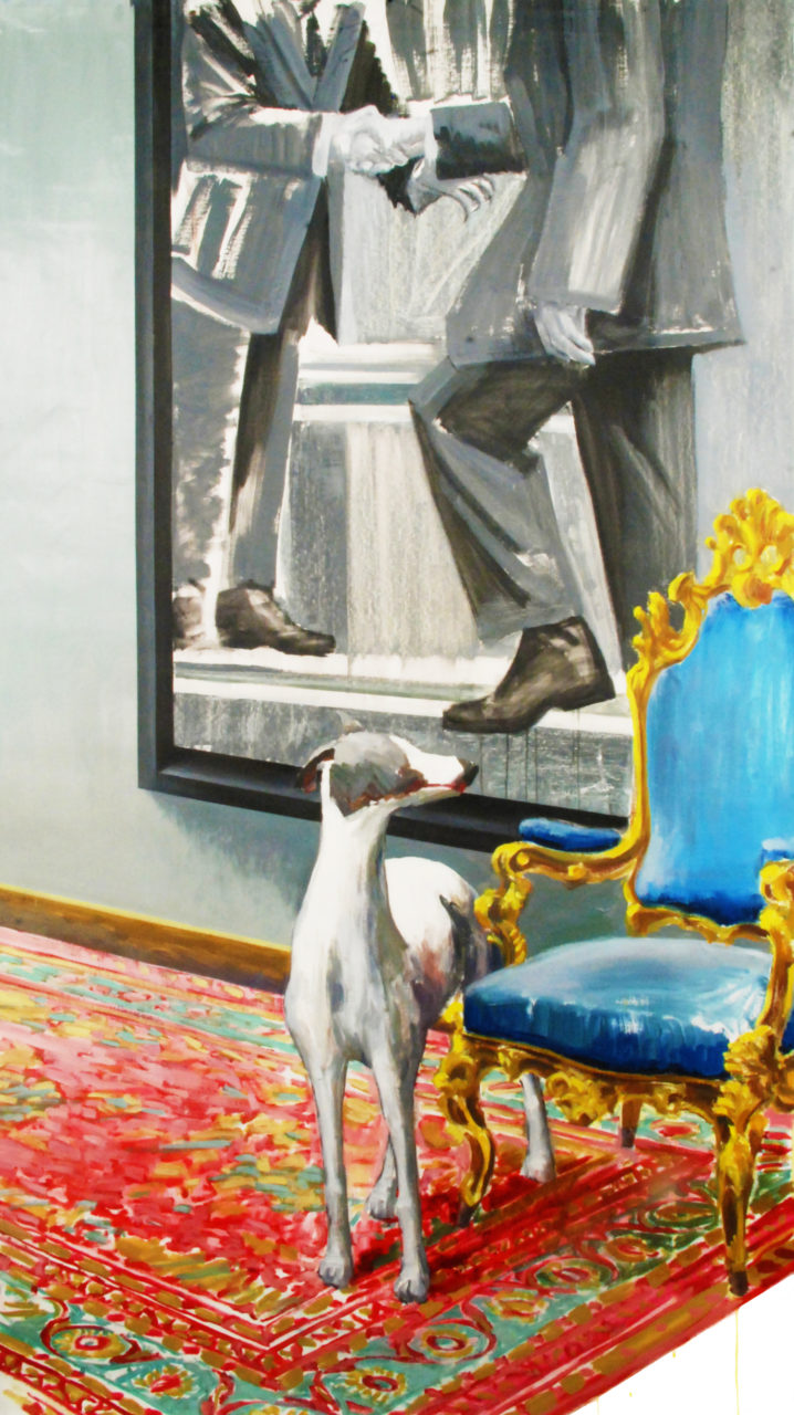 七年前,我在互联网上看到了希特勒和他的狗(布朗迪)的照片。 而后,我在维基百科中得知希特勒在他的狗身上测试了自杀的毒药。 由此,我想到了“平庸之恶”,“希特勒的孩子”,先锋队……为此我想追问一个问题:我们的父母与我们,以及我们的国家与孩子之间到底是什么关系?由此我创作了这四幅画。 在创作过程中,大数据搜索的历史图像为我的创作提供了很多动力和灵感。