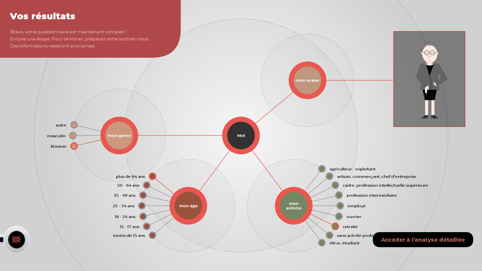 在博物馆展场中,展览参观者可以使用的数字互动形式是一个提供了新的可能性的案例。透过一系列的问题回答和操作,这些互动式的问答工具让参观者能够置身于展览主题中:参观者与展览的科技主题、生物伦理学主题、超人类主义等等的关系。参观者回答的讯息会存在一个可以容纳成千上万内容的数据库中。然后,演算法使我们可以根据一定数量的分析轴线来综合每个参观者答案。透过使用三个轴线,就可以在三度空间中确认位置。所有的答案形成了一个可以依照参观者的不同特征(年龄、性别、职业类别等)过滤成云状物,并标示每位参观者相较于其他参观者在三度空间中的明确位置。
