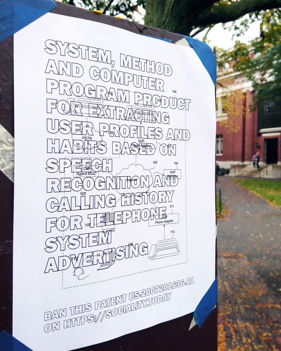 这件作品透过介入发明与运用不道德的人工智慧、使用者经验、介面设计、数据挖掘、网路监控、记忆感应和演算法等来问责。这些技术必须像化学、生物学和遗传学的发展一样被管理和控制。因此,禁止毒品和危险的发明应该扩展到信息技术。基于这个论点,艺术家邀请大家透过《社会性》网站的互动和检举禁止这些专利。这种刺激和参与性的部分引起人们参与民主和合作监督的热情。专利流程图由简短的叙述和专利号码组成,可以在网上分享或透过实体印刷的方式分享。这些文件最后将被寄给立法者、学者、社会运动参与者和记者,以倡导对这些公开检视的技术进行监管和禁止的可能。