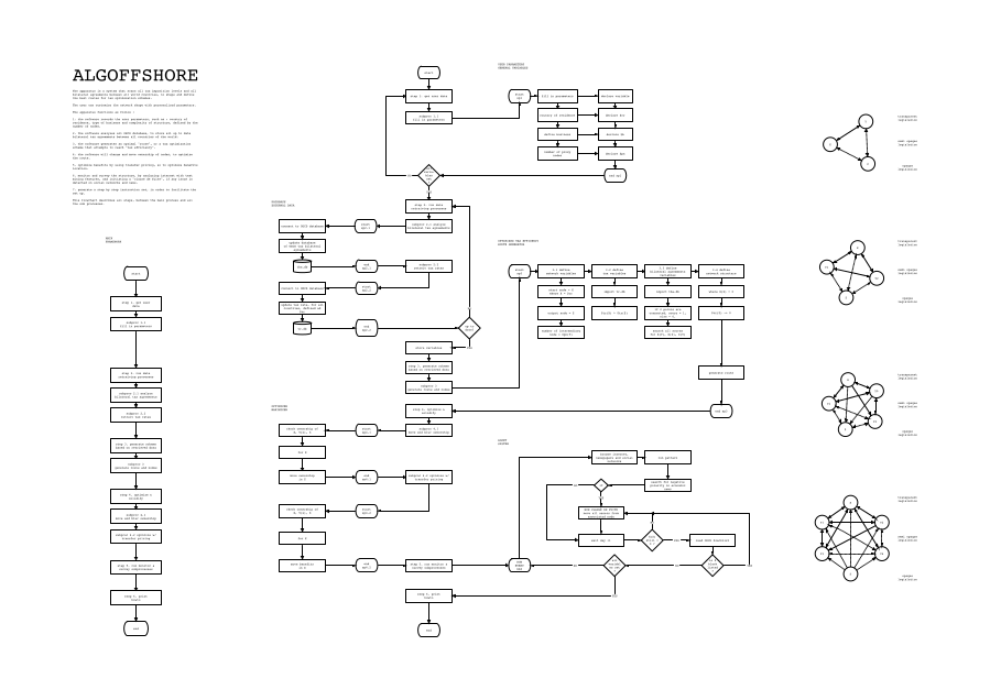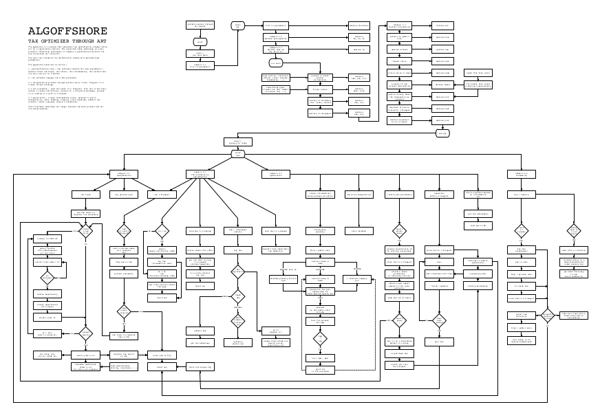 以调查形式呈现的作品《大离岸》中的Algoffshore系列在自动系统中提出了一个优化金融资产管理的投机演算模式。每个演算模式是一个杜撰的故事,如同一件纪录作品,建立于复杂的财税组合和自动系统专利的文献交叉分析。每个模型同时也是经过相关部门专业人员审核的潜在可行系统。