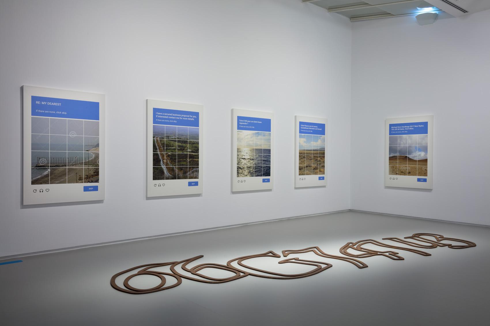 就算我们今天不能像胶卷或相片那样地触摸和拿起这些非物质的图像,我们还是可以质疑产生、储存和流通这些图像的后果。这些数字影像具有什么样的物质性?展览单元“原料”(matières premières)与“交流”(échanges)的作品为我们提供了思考的空间。艺术家杰夫・盖斯(Jeff Guess)的作品《可寻址性》(Addressability,2011)是一个与国际线上媒体即时连接的投影装置。艺术家开发了一个软件,可以让我们选择并拍摄影像,然后在我们眼前分割和重组。他不但让我们透过几百万的画素来看影像的构成,也让我们看到影像的运作:在我们搜寻与交流过程中,这些小单位的移动、聚集与分散。杰夫‧盖斯也让我们注意到数字影像的新本质:即时影像流。这个图像以难以置信的速度,机械化地在我们眼前与记忆中组合与分解、出现又消失。这也是艺术团队DISNOVATION.ORG的作品《海盗电影》(The Pirate Cinema 2012-2014)的核心,透过对等网路的即时影像交换和艺术家劳伦・赫雷特(Lauren Huret)与Fragmentin团队为国立网球场现代美术馆的虚拟空间所做的《burningcollection.tv》,在一个知名共享平台上,选出并汇集观看次数最多的五个影像。杰夫・盖斯作品有趣的地方在这些作品将这些现象具体化并放慢速度让我们可以思考,并让我们质疑它的空虚。穿过展间部分的光束也让我们意识到,没有电,这些图像是不存在的。为了存在和移动,这些图像依赖于我们对能源和电信网路的使用。这正是居住在法国的巴勒斯坦艺术家泰西尔・巴特尼吉(Taysir Batniji)的作品《中断》(Disruptions 2015-2017)所强调的。他的装置作品是他与其居住在加萨走廊家人的WhatsApp对话截图,作品展示了软件的缺陷(像素不佳、影像模糊和变形)而导致他们的沟通不良。《中断》因此对数字影像存在的物质、经济和政治条件提出质疑。这件作品同时也强调这些数字影像在个人和政治之间的关系。