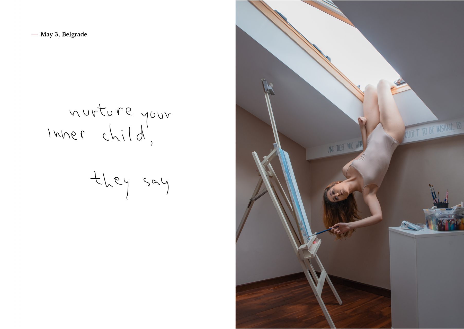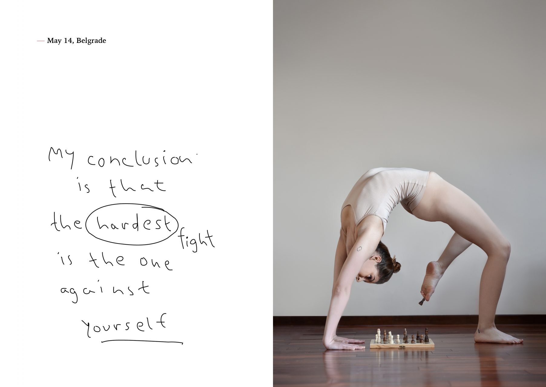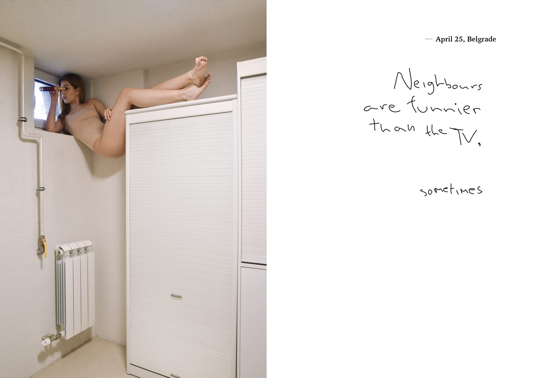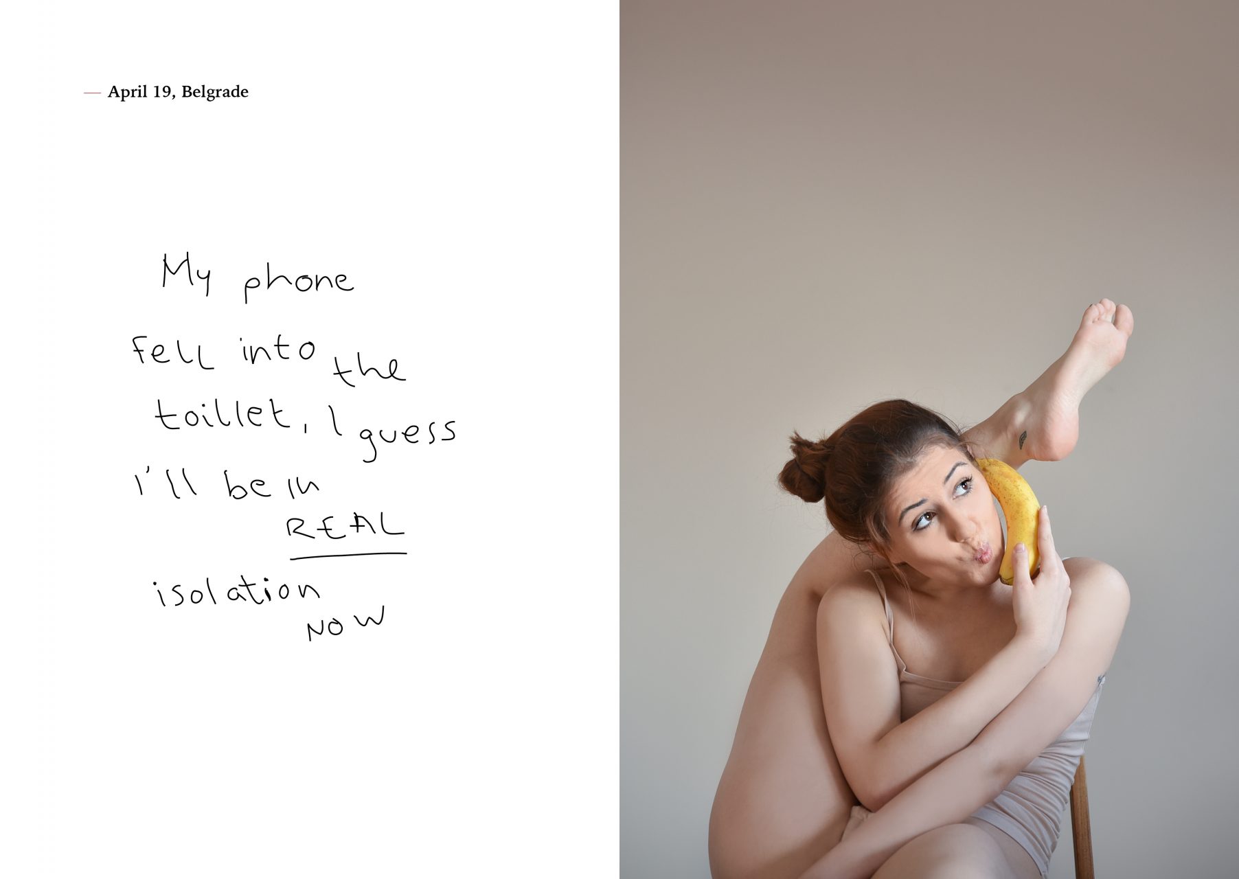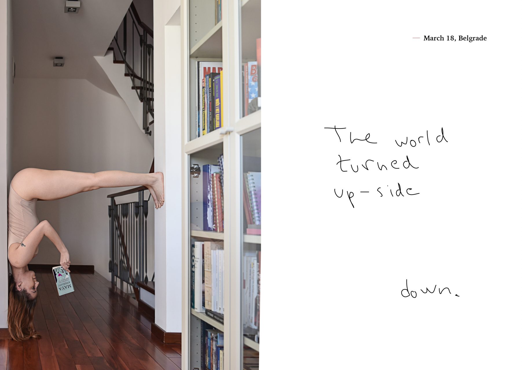 Diary From Quarantine (Journal depuis la quarantaine) est une série inspirée par le confinement imposé par la pandémie de COVID-19. Rester chez moi a fait surgir des questionnements et des difficultés créatives mais aussi des moments de doute, de surcharge mentale, de peur et de réajustements. Résolue à tirer le meilleur parti de la situation, je me suis dédiée à réaliser une nouvelle série d’autoportraits. En réunissant mes deux passions – le yoga et la photographie – j’ai voulu montrer ce qui me permettait de garder mon équilibre mental. En montrant des gestes courants avec dérision, j’ai voulu créer un lien avec le public à travers l’humour. Nous pouvons tous nous identifier aux difficultés auxquelles le coronavirus nous a confronté, mais cette série montre que nous ne sommes pas contraints à en voir uniquement l’aspect négatif.