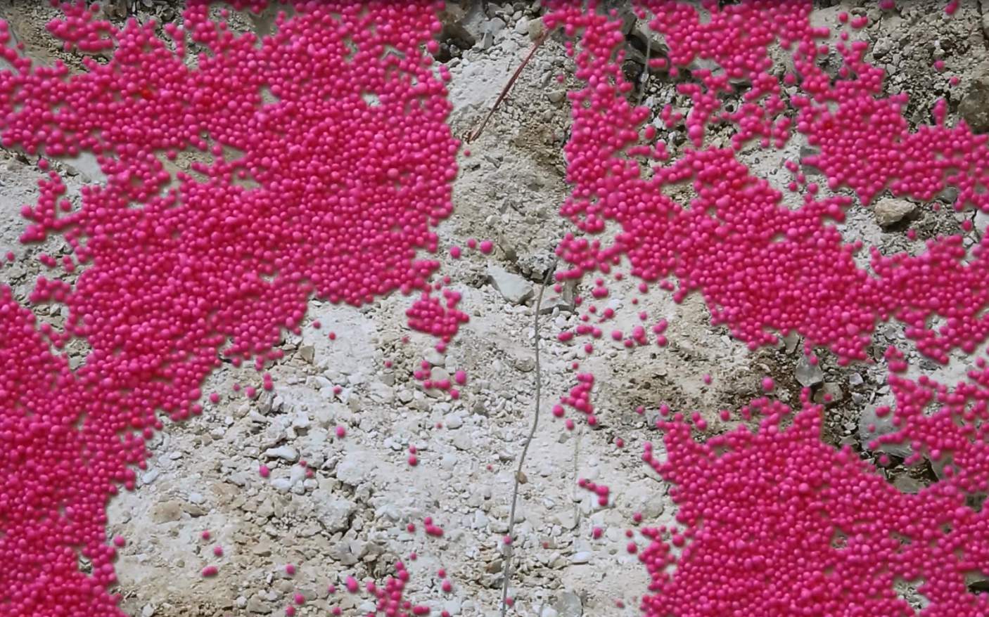 Dans leurs danses, les pierres créent des lignes et des dessins. Elles sont plus légères que l’air et gracieuses. Ces chorégraphies capturées par l’artiste Roni Ben Ari s’accompagne de l’œuvre Pop Rocks : un balai de camions remplis de billes roses, ressemblant à des bonbons : la dynamique utilisée pour réduire les blocs. A travers ces œuvres vidéos et photographiques, Roni Ben Ari questionne la notion de danger et le sens donné aux mots et aux éléments que nous produisons ou utilisons.