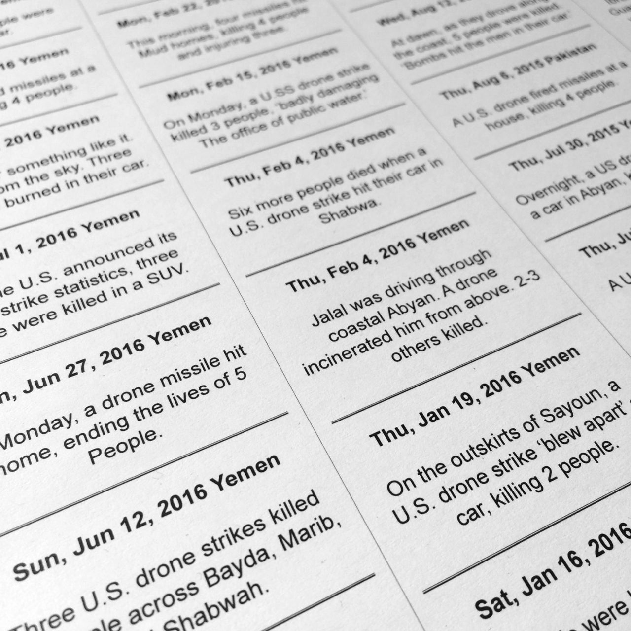 En 2012, l’artiste numérique américain Josh Begley développe une application pour iPhone, METADATA+, qui recense les frappes de drones américains au Pakistan, au Yémen et en Somalie. Refusée à de nombreuses reprises par Apple qui qualifiait le projet de Begley de « excessively objectionable or crude content », l’application est finalement autorisée en 2014, après deux ans d’attente. Basée sur les données du Bureau of Investigative Journalism, à chaque fois qu’une frappe de drone a lieu dans l’un de ces pays, l’utilisateur de l’application reçoit une notification l’informant du lieu de l’impact et des dégâts occasionnés. Il peut ensuite accéder à une carte, qui archive toutes les frappes qui ont eu lieu depuis 2002. J’avais téléchargé cette application en 2017 (mais elle semble avoir été supprimée depuis), afin d’archiver toutes les frappes de drone recensées par l’application, de manière décroissante, entre le 16 juin 2017 et le 03 novembre 2002. Présentées comme telles (voir images ci-dessous) les informations transmises par l’application étaient particulièrement glaçantes, sans ambiguïté, et semblaient tout droit sorties d’une rubrique nécrologique en temps réel, celle de notre monde contemporain.