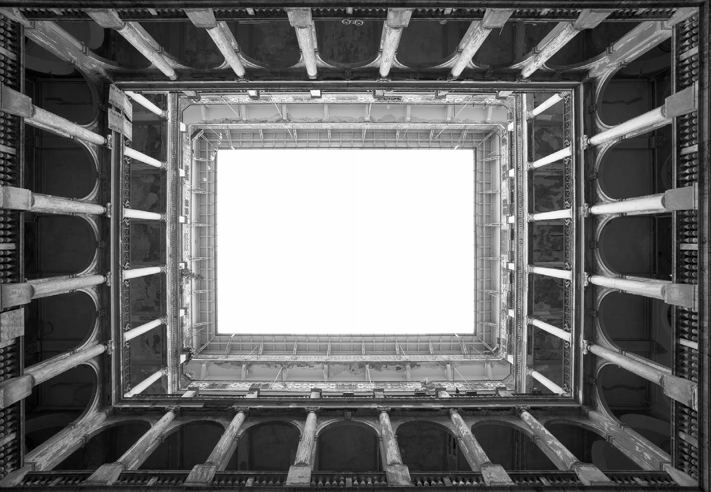 A ce stade, nous mentionnerions des œuvres qui font partie, ou constituent une sous-catégorie, de ce qui précède – des œuvres qui sont inclues dans des champs d’investigation plus larges. Cette sous-catégorie peut inclure des œuvres ouvertes, infinies, en cours ou infinissables, ainsi que des collections encyclopédiques de matériaux visuels et leur réélaboration. A titre d’exemple, nous pouvons citer la série photographique d’Ákos Czigány sur les cours intérieures de Budapest, Skies – Hommage à Hiroshi Sugimoto, réunies grâce au prix Lucien Hervé et Rudolf Hervé, et dans laquelle le contour délicat des toits, vus depuis la cour, encadre le ciel qui apparaît en de large zones blanches et homogènes, comme les écrans dans la série de Sugimoto autour des cinémas et à laquelle je reviendrai plus tard dans cet article. En ce sens, l’héritage architectural historiciste et moderniste de Budapest est non seulement délimité et collecté, mais également transformé via un changement de statut – de matériel architectural en matériel visuel – qui devient ainsi un élément pictural constitutif de la nouvelle œuvre.