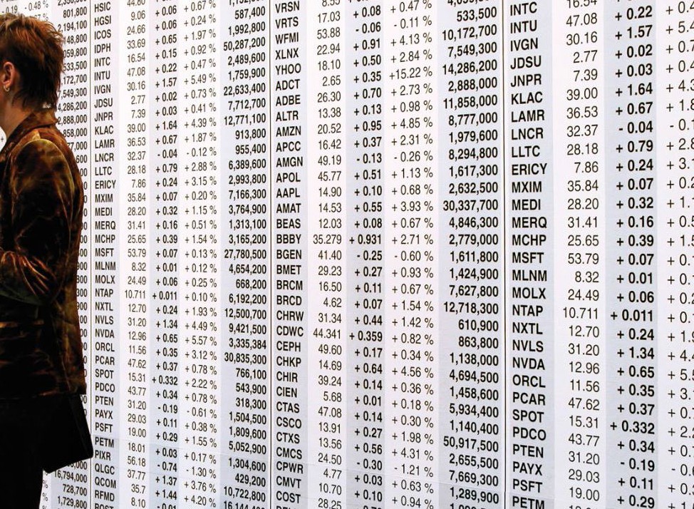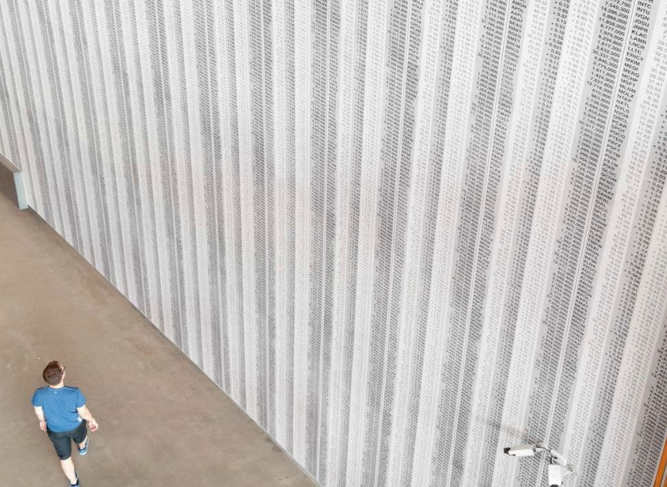 Claude Closky utilise des données visuelles, et la qualité visuelle des données, d’une manière différente dans son œuvre de 2003 intitulée Untitled (NASDAQ), pour laquelle tout le mur d’une galerie a été couvert d’un papier-peint conçu par Closky contenant des données issues de la bourse. Il va sans dire que les chiffres perdaient tout leur sens, non seulement parce qu’il était impossible d’en percevoir l’immense quantité, mais aussi parce qu’ils perdaient également leur actualité, car que dans notre économie au rythme incessant, c’est toujours la dernière valeur qui compte. Dans le cas de Closky, nous avons une large part du Big Data qui est retirée de son contexte et utilisée pour sa pure qualité visuelle, afin de créer un motif décoratif. L’artiste réussit donc à la fois à impressionner le spectateur grâce à « l’utilisation » inhabituelle des chiffres et de l’information, et en même-temps à implicitement se moquer des aspects commerciaux du marché de l’art mondial et son infrastructure.