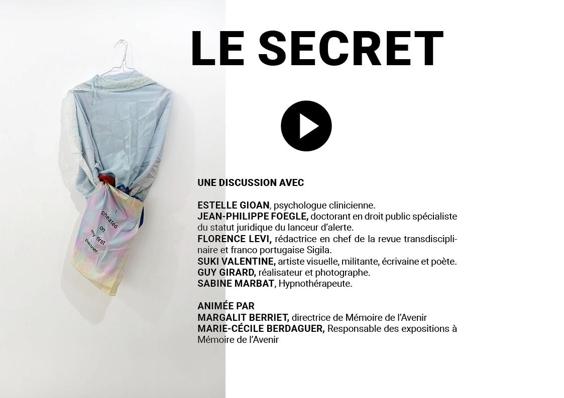 La discussion Le Secret s’est tenue le 30 Janvier 2021 dans le cadre de l’exposition Sous le pli / Under Wraps de Suki Valentine présentée en ligne sur le site de Mémoire de l’Avenir. Elle fait partie des interrogations que Suki Valentine développe depuis plusieurs années sur la portée du secret – lié à l’histoire d’un pays, ou à l’histoire d’un individu, de sa famille – dans la construction personnelle et collective.