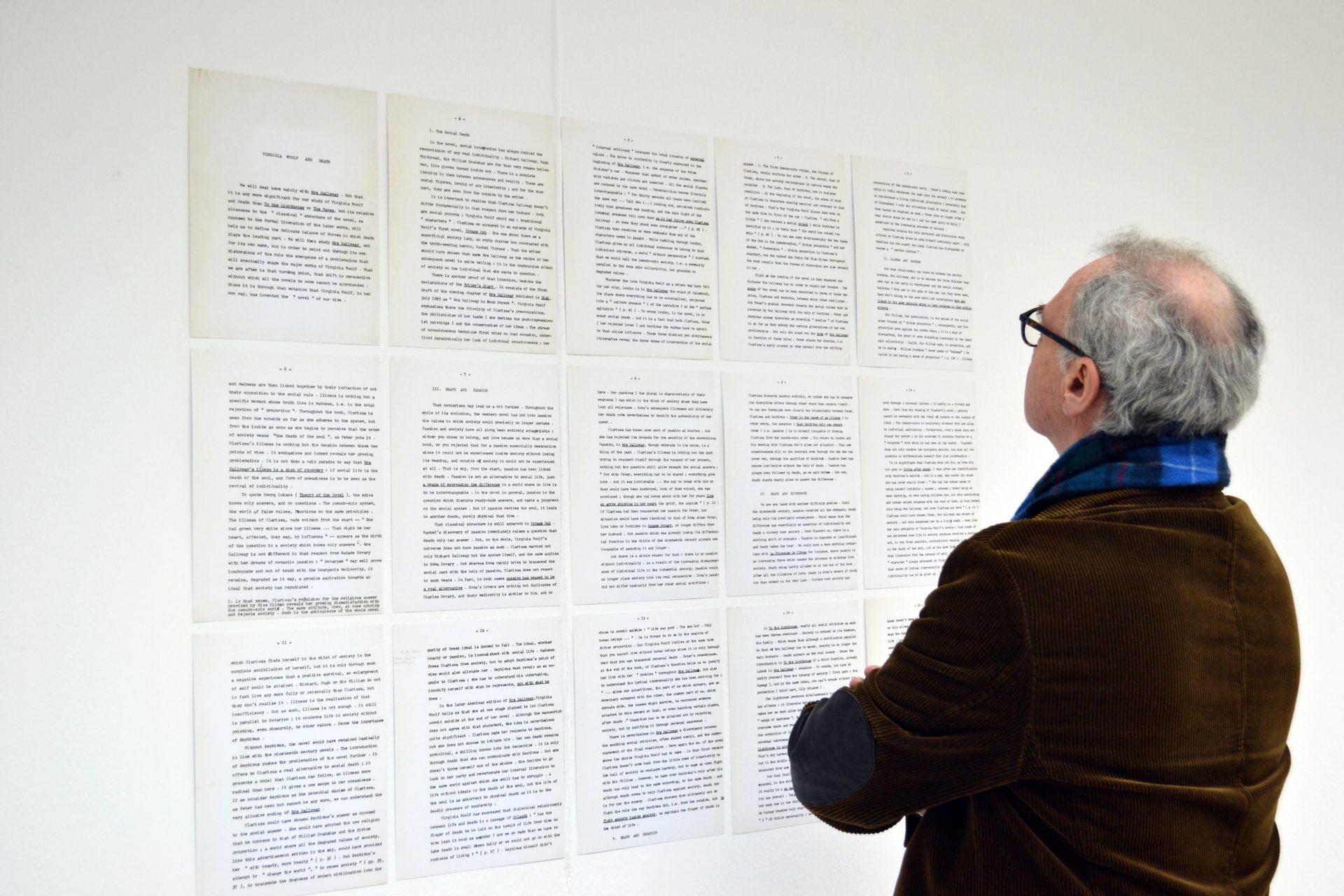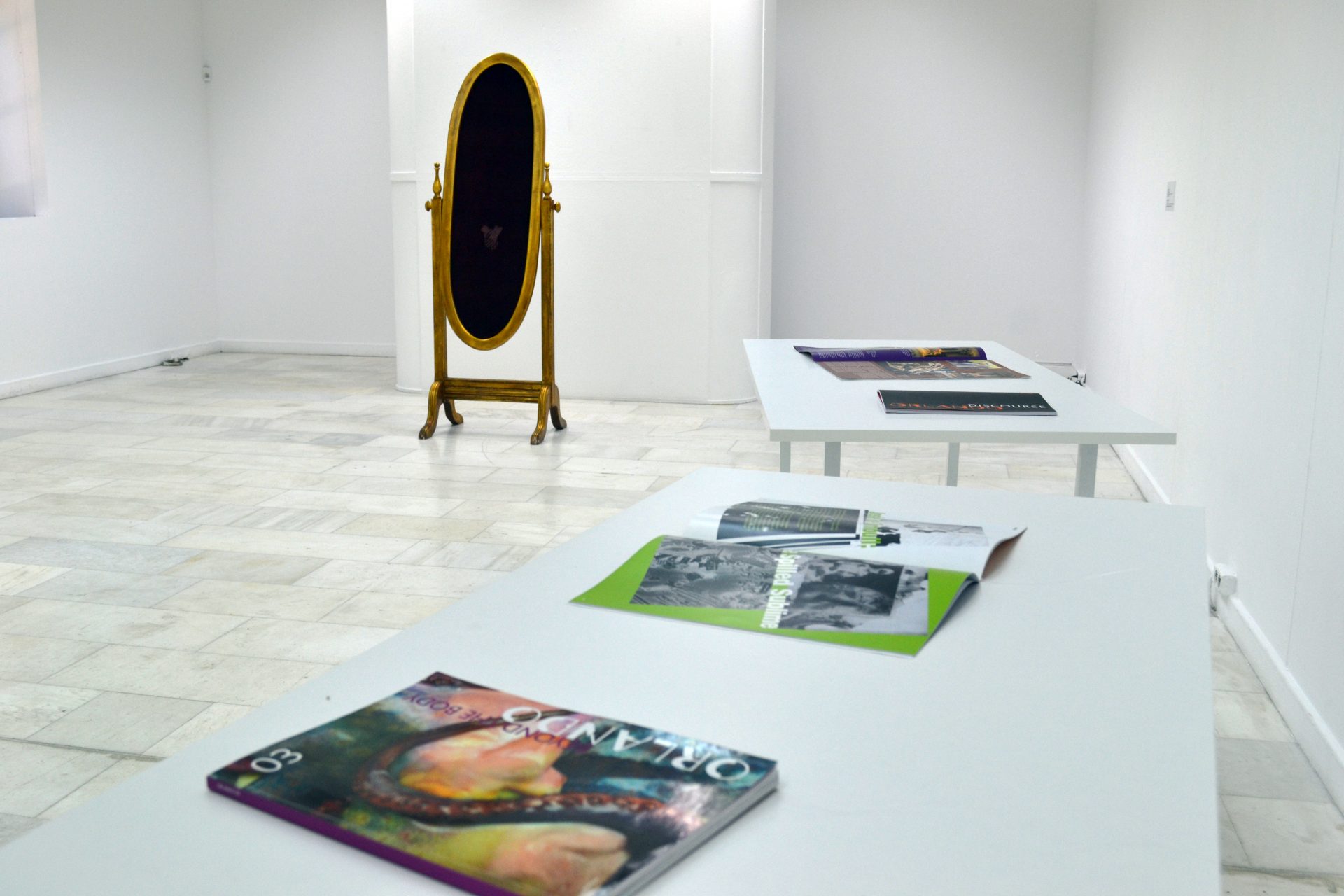 En 1964, alors qu’il est étudiant, l’écrivain, chercheur et fondateur de la revue Semiotext(e) Sylvère Lotringer, décide de consacrer sa thèse à Virginia Woolf et à sa chambre, sous la direction de Roland Barthes et Lucien Goldmann. Le résultat est un essai intitulé« Virginia Woolf : de la mort des valeurs aux valeurs de la mort » (1969). Présentée dans l’exposition dans son format original, accrochée au mur, c’est une œuvre dactylographiée qui rappelle la première rencontre de Sylvère Lotringer avec Virginia Woolf et l’influence de la romancière sur celui-ci. La sculpture miroir de l’artiste visuel Maro Michalakakos, intitulée « Chère Prudence » (Dear Prudence, 1996), se concentre sur stéréotypes dominants concernant le genre féminin. Son reflet sur du velours rouge ne montre que deux mains dans un geste timide et prudent – des traits souvent attribués à tort aux femmes. En 2014, l’écrivaine et critique d’art Philomena Epps a créé « Orlando » (œuvre en cours), une publication indépendante axée sur les arts visuels et leurs croisements avec la critique culturelle et la sociopolitique. Le titre, faisant référence au protagoniste transgressif du roman éponyme de Virginia Woolf, démontre un investissement particulier dans les politiques féministes et queers. Pendant l’exposition, « Orlando » a été présenté comme une œuvre d’art, allusion aux magazines et aux publications féministes fonctionnant comme une forme d’art alternative. Enfin, à l’occasion de l’exposition, l’écrivaine, conservatrice et artiste Jeanne Graff a été invitée à aborder les notions primaires de Virginia Woolf à travers sa pratique multidisciplinaire. Le travail de Jeanne Graff a donné lieu à une grille sans titre faite de notes, de livrets, de sons et d’images, une vitrine personnelle d’objets et de récits qui reflète bien son microcosme de créatrice indépendante.