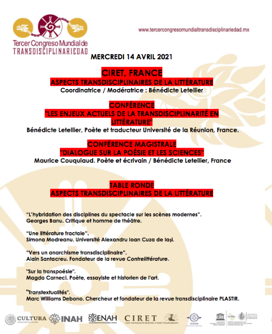Part of the academic programme of the 3rd World Congress of Transdisciplinarity Online (30 Oct 2020-17 Sept 2021), this day is part of a session (14-16 April) on transdisciplinary issues in literature organised by Bénédicte Letellier, Professor of Comparative Literature at the University of La Réunion, under the aegis of CIRET (France). The event will be broadcast live in French and simultaneously translated on youtube into 112 languages. Those wishing to participate should register beforehand on https://www.youtube.com/c/3CMTr and click on the Subscribe button.