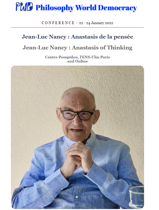 Our friends, Philosophy World Democray (PWD), are holding a conference, between 22 and the 24 January 2022, around Jean-Luc Nancy’s body of work at the Pompidou Center (Paris), the Ecole Normale Supérieure (Paris) and online.