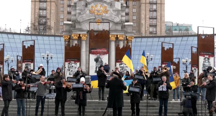 In KYIV, March 9 (Reuters) On Kyiv Independant Square, an orchestra lead by Herman Makarenko , UNESCO Artist for Peace and conductor of the National Academic Opera and Ballet Theatre of Ukraine, assembled before a small crowd on Wednesday to play the national anthem as Russian forces advanced on the city.