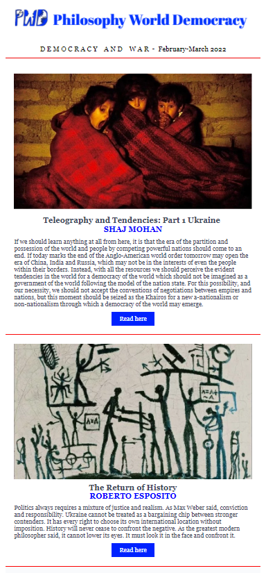 Our friends Philosophy World Democracy‘s latest articles reflecting philosophically (and ethically) on Democracy and War are available!